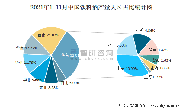 2021年1-11月中國飲料酒產量大區占比統計圖