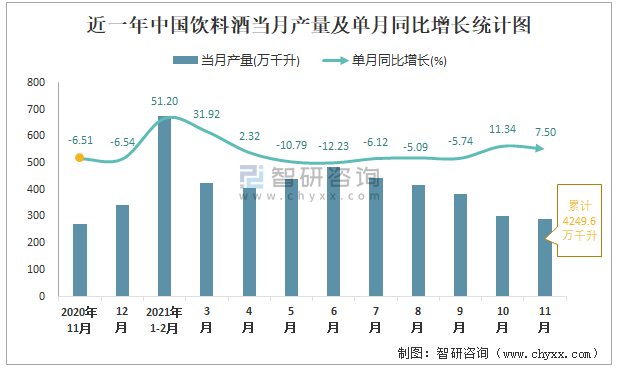 根據國家統計局數據顯示:2021年11月中國飲料酒產量為288萬千升,同比增長7.5%;2021年1-11月中國飲料酒累計產量為4249.6萬千升,同比增長4.96%;2015-2020年中國飲料酒產量逐年遞減,2020年達到最低。