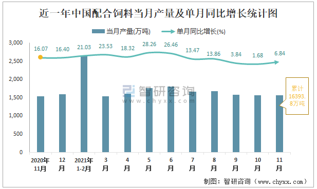 根據(jù)國(guó)家統(tǒng)計(jì)局?jǐn)?shù)據(jù)顯示:2021年11月中國(guó)配合飼料產(chǎn)量為1561萬(wàn)噸,同比增長(zhǎng)6.84%;2021年1-11月中國(guó)配合飼料累計(jì)產(chǎn)量為16393.8萬(wàn)噸,同比增長(zhǎng)14.84%;2015-2020年中國(guó)配合飼料產(chǎn)量2018年跌至最低,此后逐年遞增。
