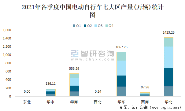 2021年1-11月中國電動自行車產量為3328.1萬輛 華北地區產量最高(占比42.76%)