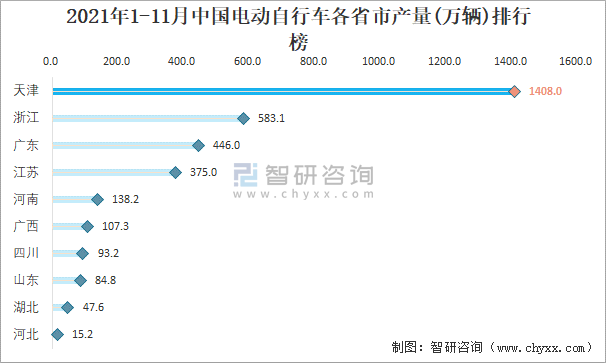 根據國家統計局數據顯示:2021年各季度中國電動自行車主要集中在華北、華東、華南地區生產;2021年1-11月中國電動自行車產量大區分布不均衡,其中華北地區產量最高,特別是天津市貢獻了最多產量;2021年1-11月中國電動自行車各省產量top1遙遙領先于其他前9名。