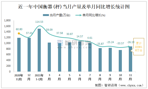 2021年1-11月中國衡器(秤)產(chǎn)量為10381.8萬臺(tái) 同比增長10.42%