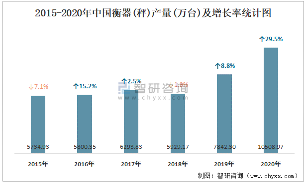 2015-2020年中國衡器(秤)產(chǎn)量及增長率統(tǒng)計(jì)圖
