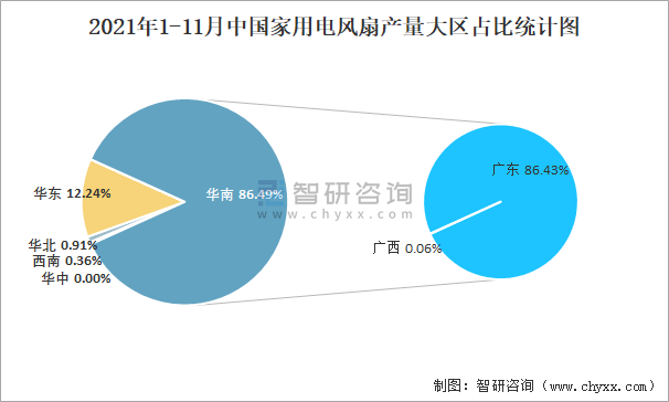 2021年1-11月中國家用電風扇產量大區占比統計圖