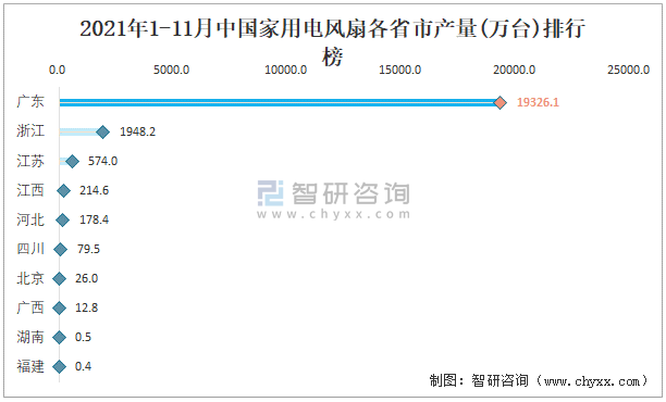 2021年1-11月中國家用電風扇各省市產量排行榜