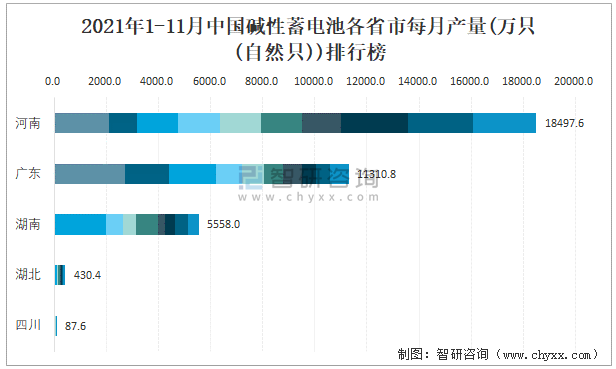 根據(jù)國家統(tǒng)計局?jǐn)?shù)據(jù)顯示:2021年各季度中國堿性蓄電池主要集中在華中、華南、西南地區(qū)生產(chǎn);2021年1-11月中國堿性蓄電池產(chǎn)量大區(qū)分布不均衡,其中華中地區(qū)產(chǎn)量最高,特別是河南省貢獻(xiàn)了最多產(chǎn)量;2021年1-11月中國堿性蓄電池只在少數(shù)幾個省份生產(chǎn),河南、廣東、湖南等省產(chǎn)量最多。