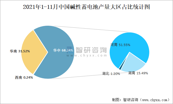 2021年1-11月中國堿性蓄電池產(chǎn)量大區(qū)占比統(tǒng)計圖