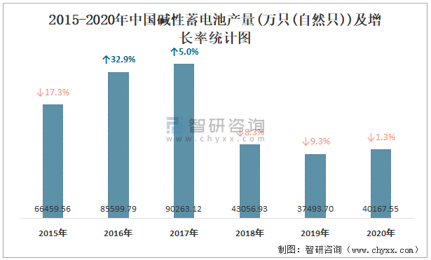 2015-2020年中國堿性蓄電池產(chǎn)量及增長率統(tǒng)計圖
