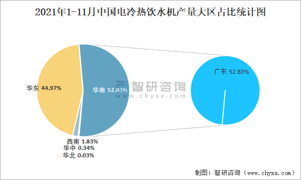 2021年1-11月中國電冷熱飲水機產量大區占比統計圖