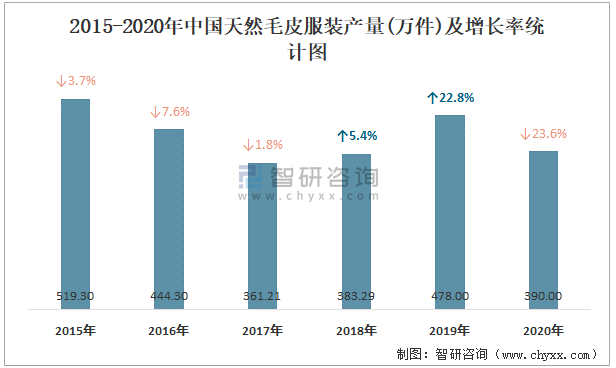 2015-2020年中國天然毛皮服裝產(chǎn)量及增長率統(tǒng)計(jì)圖