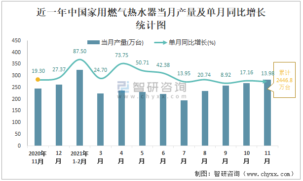 根據(jù)國家統(tǒng)計(jì)局?jǐn)?shù)據(jù)顯示:2021年11月中國家用燃?xì)鉄崴鳟a(chǎn)量為284萬臺(tái),同比增長13.98%;2021年1-11月中國家用燃?xì)鉄崴骼塾?jì)產(chǎn)量為2446.8萬臺(tái),同比增長31.55%;2015-2020年中國家用燃?xì)鉄崴鳟a(chǎn)量總體呈現(xiàn)上升趨勢,2020年達(dá)到最高。