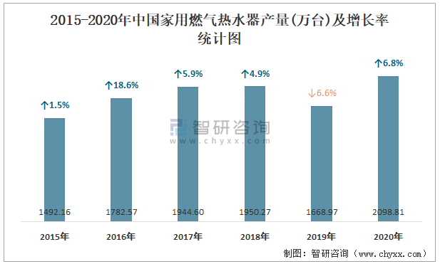 2015-2020年中國家用燃?xì)鉄崴鳟a(chǎn)量及增長率統(tǒng)計(jì)圖