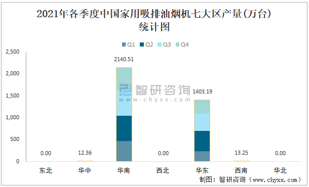 2021年各季度中國家用吸排油煙機七大區產量統計圖