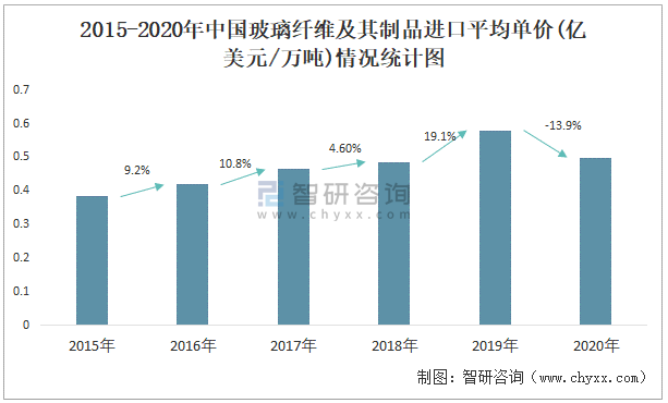 2015-2020年中國玻璃纖維及其制品進口平均單價(億美元/萬噸)情況統計圖