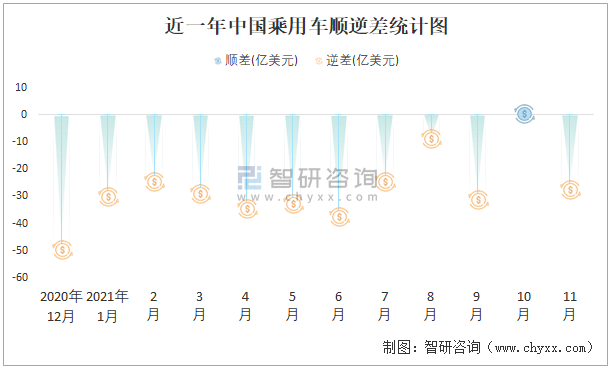 根據(jù)中國海關(guān)數(shù)據(jù)顯示:近一年中國乘用車進(jìn)口金額總體大于出口金額,進(jìn)出口貿(mào)易以逆差為主,11月由順差轉(zhuǎn)為逆差。