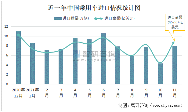 根據(jù)中國海關(guān)數(shù)據(jù)顯示:2021年11月中國乘用車進(jìn)口數(shù)量為8.03萬輛,同比下降24%,進(jìn)口金額為52.67億美元,同比下降0.1%,2021年11月中國乘用車出口數(shù)量為17.41萬輛,同比增長74.8%,出口金額為24.93億美元,同比增長105.9%;2021年1-11月中國乘用車進(jìn)口數(shù)量為86.84萬輛,進(jìn)口金額為487.71億美元,出口數(shù)量為149.24萬輛,出口金額為206.49億美元。
