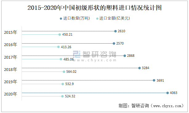 2015-2020年中國初級形狀的塑料進口情況統計圖