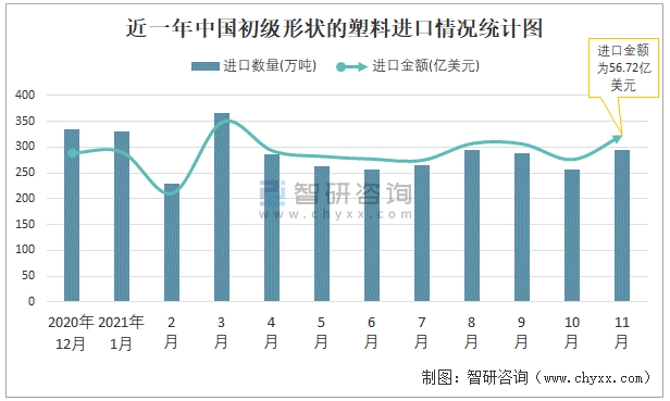 根據中國海關數據顯示:2021年11月中國初級形狀的塑料進口數量為295萬噸,同比下降18.2%,進口金額為56.72億美元,同比增長13.4%,2021年1-11月中國初級形狀的塑料進口數量為3128萬噸,進口金額為558.61億美元。