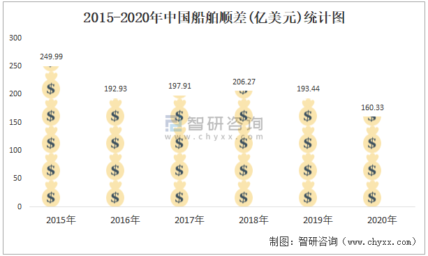 2015-2020年中國船舶順差(億美元)統(tǒng)計圖