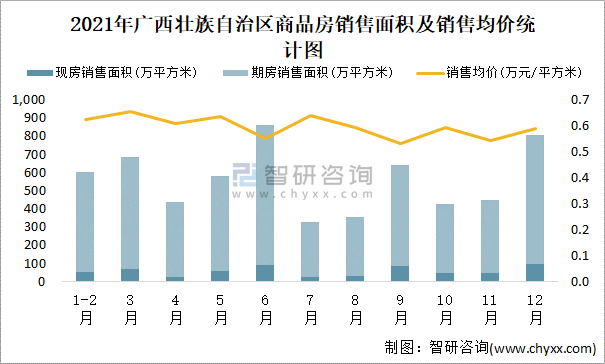 2021年廣西壯族自治區商品房銷售面積及銷售均價統計圖