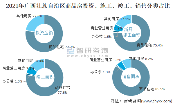 根據國家統計局數據統計可知:2021年廣西壯族自治區房地產開發企業在商品住宅中投資金額占比為77.7%(注:只有投資金額中其他用房包含辦公樓、商業營業用房),商品住宅的新開工面積與竣工面積所占比重差異不大,從銷售面積來看,商品住宅為銷售主力(占比高達85.5%),辦公樓銷售面積占比少于商業營業用房銷售面積占比。