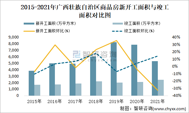 2015-2021年廣西壯族自治區商品房新開工面積與竣工面積對比圖
