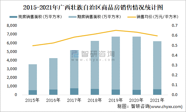 根據國家統計局數據統計可知:2021年12月廣西壯族自治區商品房銷售面積為808.63萬平方米(其中銷售現房99.07萬平方米,期房709.56萬平方米),銷售額為477.9億元,銷售均價約為0.59萬元/平方米;2021年廣西壯族自治區商品房累計銷售面積為6178.26萬平方米,銷售面積累計同比下降8.2%,累計銷售額為3672.49億元,銷售額累計同比下降13.6%;2015-2021年廣西壯族自治區商品房總銷售面積2020年達到最高值,此后有所下滑,其中期房銷售面積大大高于現房銷售面積,銷售均價2019年達到最高值,此后有所下滑。