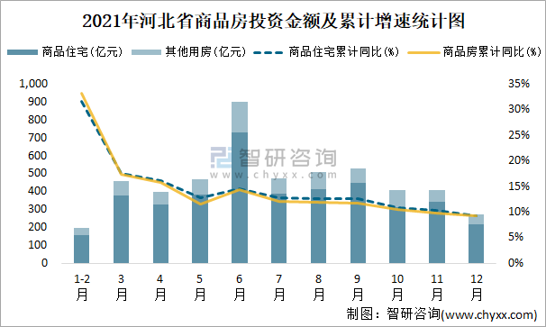2021年河北省商品房投資金額及累計增速統(tǒng)計圖