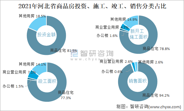 2021年河北省商品房投資、施工、竣工、銷售分類占比