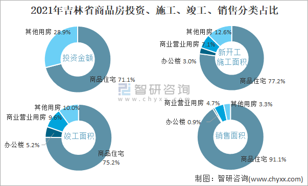 2021年吉林省商品房投資、施工、竣工、銷售分類占比