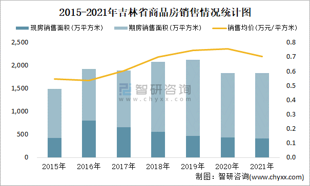 根據(jù)國家統(tǒng)計局?jǐn)?shù)據(jù)統(tǒng)計可知:2021年12月吉林省商品房銷售面積為233.18萬平方米(其中銷售現(xiàn)房64.52萬平方米,期房168.66萬平方米),銷售額為161.98億元,銷售均價約為0.69萬元/平方米;2021年吉林省商品房累計銷售面積為1836.32萬平方米,銷售面積累計同比增長0.3%,累計銷售額為1290.99億元,銷售額累計同比下降6.6%;2015-2021年吉林省商品房總銷售面積2019年達(dá)到最高值,此后有所下滑,其中期房銷售面積大大高于現(xiàn)房銷售面積,銷售均價2020年達(dá)到最高值,此后有所下滑。