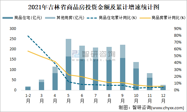2021年吉林省商品房投資金額及累計增速統(tǒng)計圖