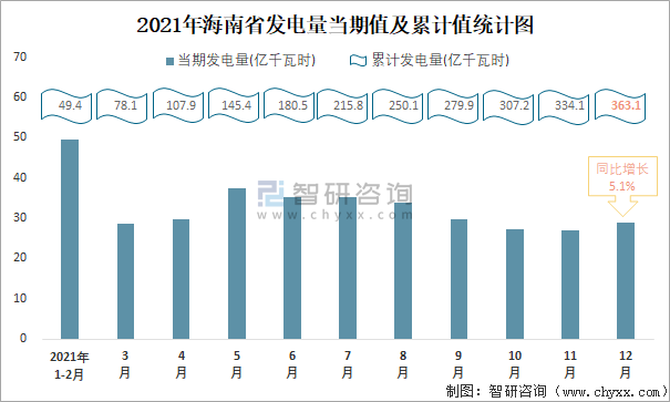 2021年海南省發電量當期值及累計值統計圖