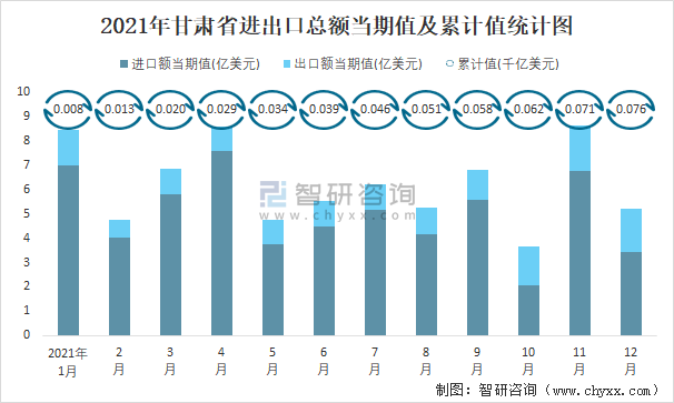 2021年甘肅省進出口總額當期值及累計值統(tǒng)計圖