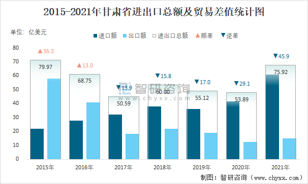2015-2021年甘肅省進出口總額及貿(mào)易差值統(tǒng)計圖