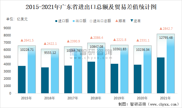 2015-2021年廣東省進出口總額及貿(mào)易差值統(tǒng)計圖