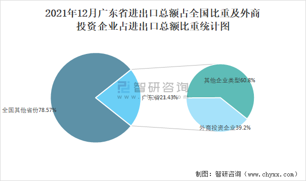 2021年12月廣東省進出口總額占全國比重及外商投資企業(yè)占進出口總額比重統(tǒng)計圖