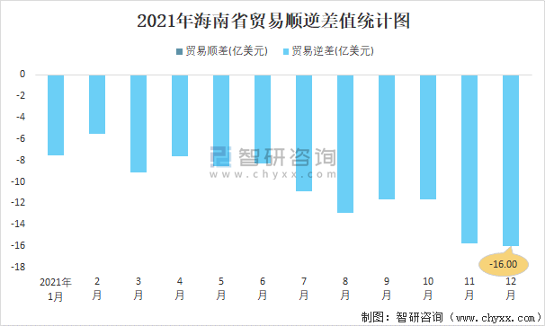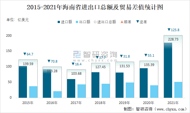 2015-2021年海南省進出口總額及貿易差值統計圖
