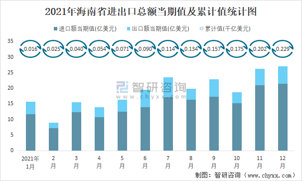 2021年12月海南省進出口總額為27.01億美元,其中進口額為21.5億美元,出口額為5.5億美元;2021年1-12月進出口總額為0.23千億美元,進出口總額(以美元計價)累計同比增長68.3%,其中累計進口額占比77.49%,累計出口額占比22.51%。2015-2021年海南省進出口總額在2017年跌至最低值,此后逐年遞增;2015-2021年海南省進出口貿易差值總體呈現貿易逆差狀態。