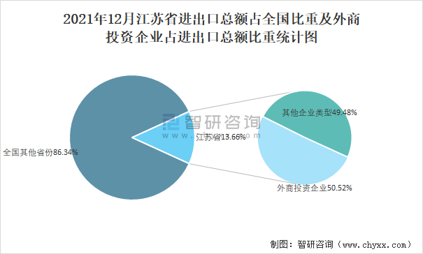 2021年12月江蘇省進出口總額占全國比重及外商投資企業占進出口總額比重統計圖