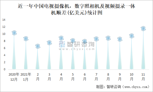 近一年中國電視攝像機,數字照相機及視頻攝錄一體機順差(億美元)統計圖