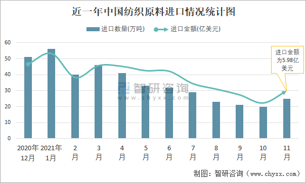 根據中國海關數據顯示:2021年11月中國紡織原料進口數量為25萬噸,同比下降25.7%,進口金額為5.98億美元,同比增長4.3%,2021年11月中國紡織原料出口數量為13萬噸,同比下降6.5%,出口金額為2.76億美元,同比增長19.8%;2021年1-11月中國紡織原料進口數量為365萬噸,進口金額為82.5億美元,出口數量為134萬噸,出口金額為26.26億美元。
