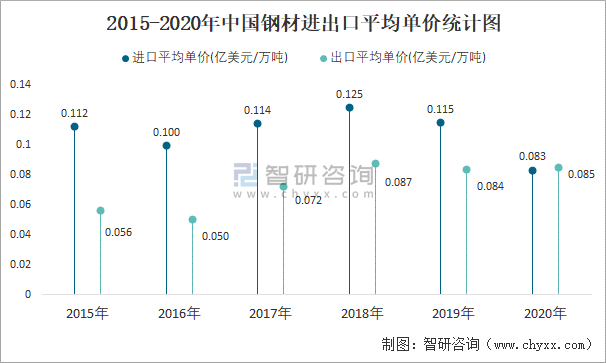2015-2020年中國鋼材進出口平均單價統(tǒng)計圖