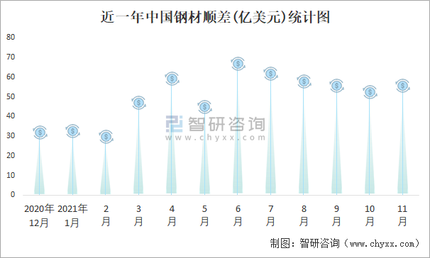 近一年中國鋼材順差(億美元)統(tǒng)計圖