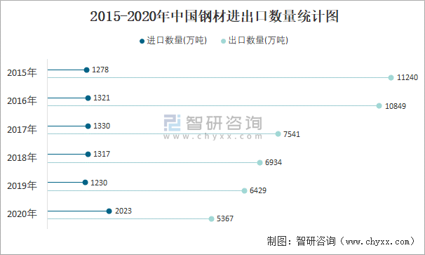 2015-2020年中國鋼材進出口數(shù)量統(tǒng)計圖