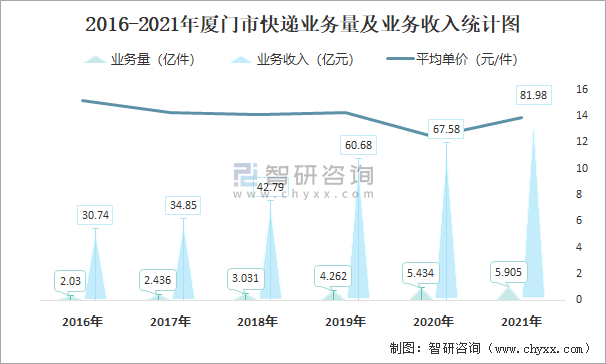 2016-2021年廈門市快遞業務量及業務收入統計圖