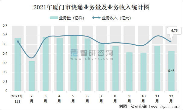 2021年廈門市快遞業務量及業務收入統計圖