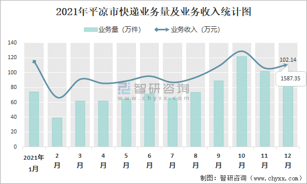 2021年平?jīng)鍪锌爝f業(yè)務(wù)量及業(yè)務(wù)收入統(tǒng)計(jì)圖