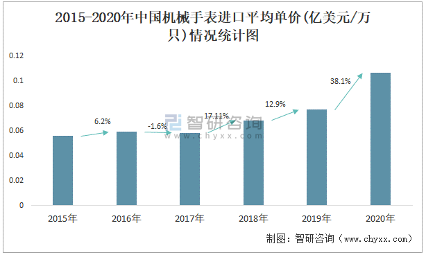 2015-2020年中國機械手表進口平均單價(億美元/萬只)情況統計圖