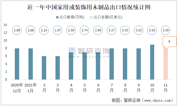 2021年11月中國家用或裝飾用木制品出口數(shù)量和出口金額分別為9萬噸和3.59億美元